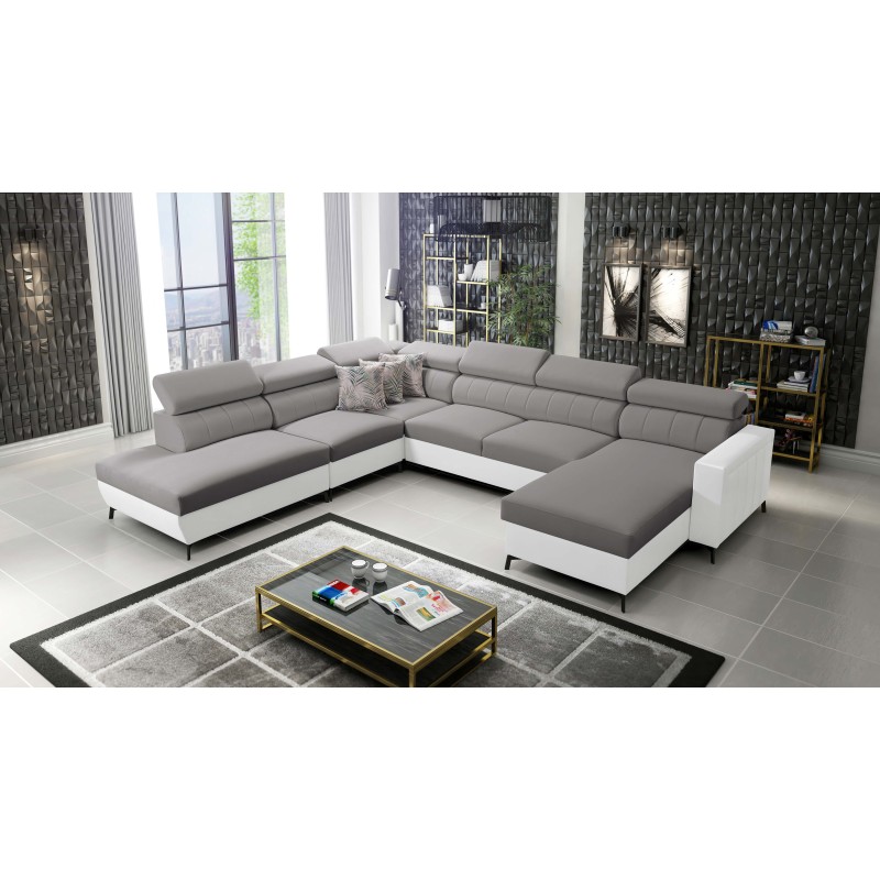 Sofá esquinero en forma de U Arco IX con función de cama, reposacabezas ajustables, tela Mono 246 + Eco-cuero.