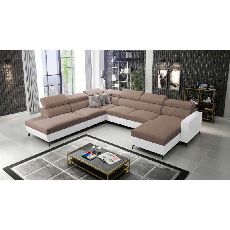 Sofá esquinero en forma de U Arco IX con función de dormir, reposacabezas ajustables, tela Sawana 25 + Eco-cuero.