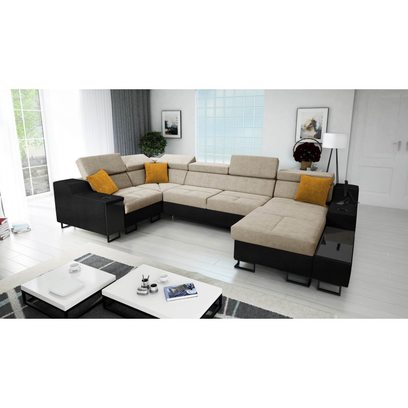 Sofá rinconera en forma de U Avanti IV Mini con función de cama y lámpara con puerto USB, tela Whisper 3 + ecopiel negra.