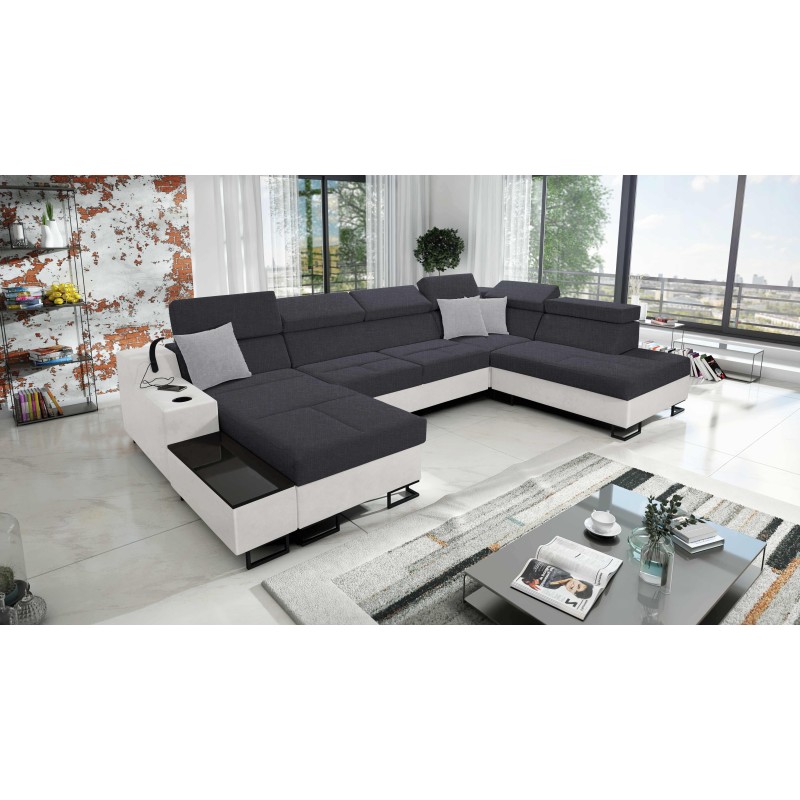 Sofá en forma de U Avanti VI con función de cama y lámpara con puerto USB en tela Sawana 96 + Cuero ecológico.