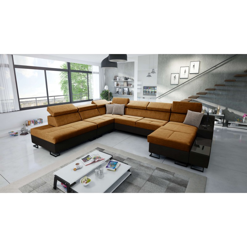 Sofá esquinero en forma de U Avanti X con función de cama y lámpara con puerto USB, tejido Whisper 9 + cuero ecológico negro.