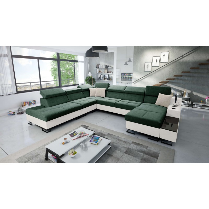 Descubre el lujo y la comodidad que ofrece el Sofá Esquinero en forma de U Avanti X con función para dormir y lámpara con puerto usb, acabado en elegante y resistente tela de terciopelo, Whisper 11 + Eco-cuero. Este mueble moderno y funcional está creado para aquellos que valoran no solo el estilo, sino también la practicidad. Diseñado con atención al más mínimo detalle, creando así una combinación única de estética y confort.