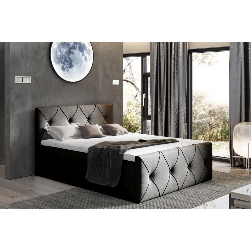 The presented Virox Lux Continental Bed is a true gem among bedroom furniture. Created from the highest quality Matt Velvet 08 fabric, its delicate texture adds elegance and nobility. The majestic, quilted headboard and front of the bed with stitching and fabric-covered buttons not only add charm but also provide excellent support while reading or resting.