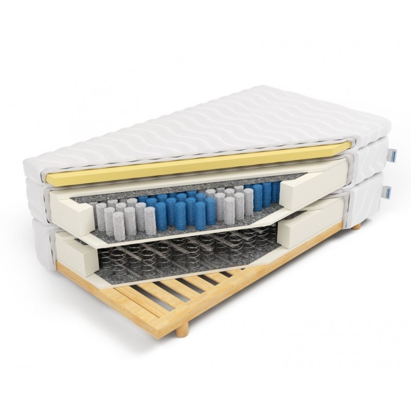 The Altea mattress is a continental mattress constructed from three layers. It combines Bonnell springs, a Pocket 7-zone pocket spring unit, and a topper made of PerfectSuite (VISCO/memory) foam. The Bonnell mattress, mounted on a frame, contains 108 springs per square meter, while the second layer is a pocket model with 272 pocket springs per square meter. The set is completed with a soft PerfectSuite (VISCO/memory) foam topper, which is 5 cm thick. The middle mattress, with pocket springs, is divided into 7 zones of firmness. The mattress is equipped with a classic pine wood frame, with the option to attach legs that are 10 cm high. The total height of the mattress with the legs (10 cm) is approximately 53 cm. The production of the mattress begins within 24 hours of the payment being recorded for the order. The warranty is 10 years for the spring insert.