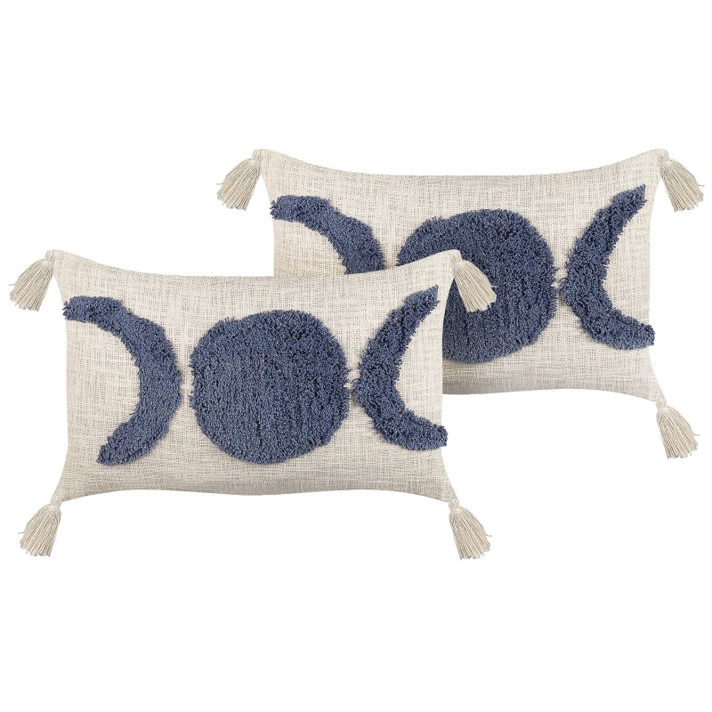 This charming set of cushions with sewn-on blue accents will make any interior feel cozy. The textured pattern and tassels on the corners give them a vintage style, making them suitable for boho or retro-themed rooms. Their rectangular shape makes them a fantastic decoration for a bed headboard. This stylish and functional set is the perfect addition to any home.