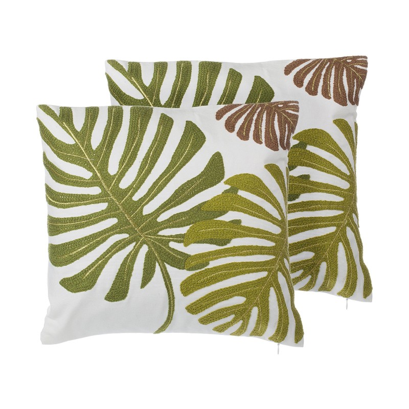 A cozy yet decorative addition to any home. These soft cushions are the perfect complement to any arrangement. The cotton cover is adorned with embroidery in the shape of a palm leaf in a delicate shade of green. Thanks to the fluffy, soft polyester filling, the cushions are perfect for occasional afternoon naps.