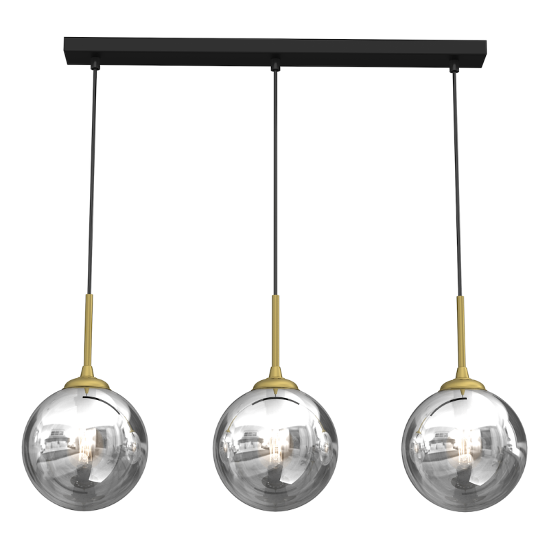 Elongated lamps in the shape of a smoked sphere are available in several sizes. The range includes sizes starting from a diameter of 140mm and going up to 170mm. The lamps can have a regular arrangement of shades or a completely asymmetrical distribution. The lamps have a tightly closed construction, which means they focus the light significantly and are strictly spotlights. E14 LED bulbs are fitted to the shades. This is a lamp in a glamour style, which in its 3-point version is perfect for hanging over a dining table. The range includes lamps with shades arranged symmetrically or irregularly. Such a variety of models is adapted to the requirements of specific rooms. The mounting of the smoked spheres has a golden accent, which breaks the gray and silver tones dominating the lamp's color scheme.