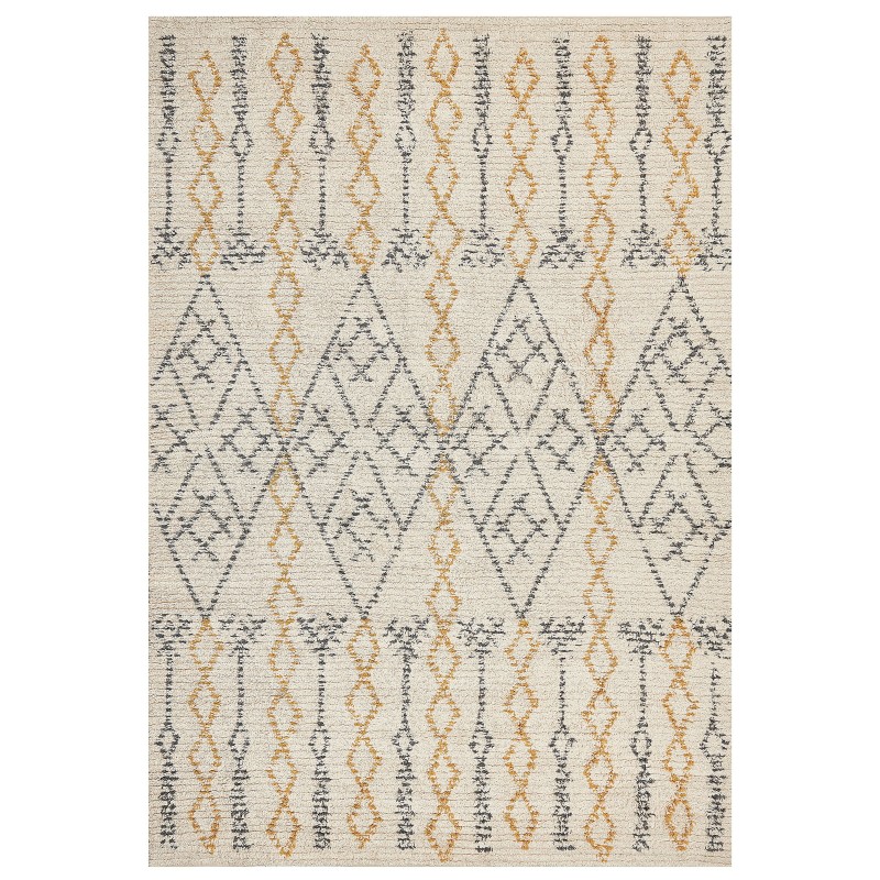 Enhance your interior with a decorative rug that will beautifully enliven any space. The product features a geometric pattern in a bold shade of yellow paired with black on a beige background. This composition particularly looks good next to a sofa or bed in a light, neutral color. Moreover, the product is hand-tufted from cotton, ensuring quality and durability for years to come.