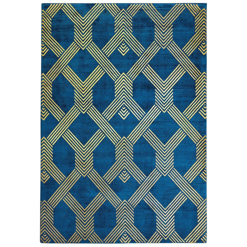 Decorate your living room, hallway, or bedroom with this elegant glamour-style rug. It is made of viscose and features a cotton backing, making it exceptionally smooth and soft to the touch despite its short pile. The golden geometric pattern with cracks on a blue background adds a luxurious touch to any room it is placed in.