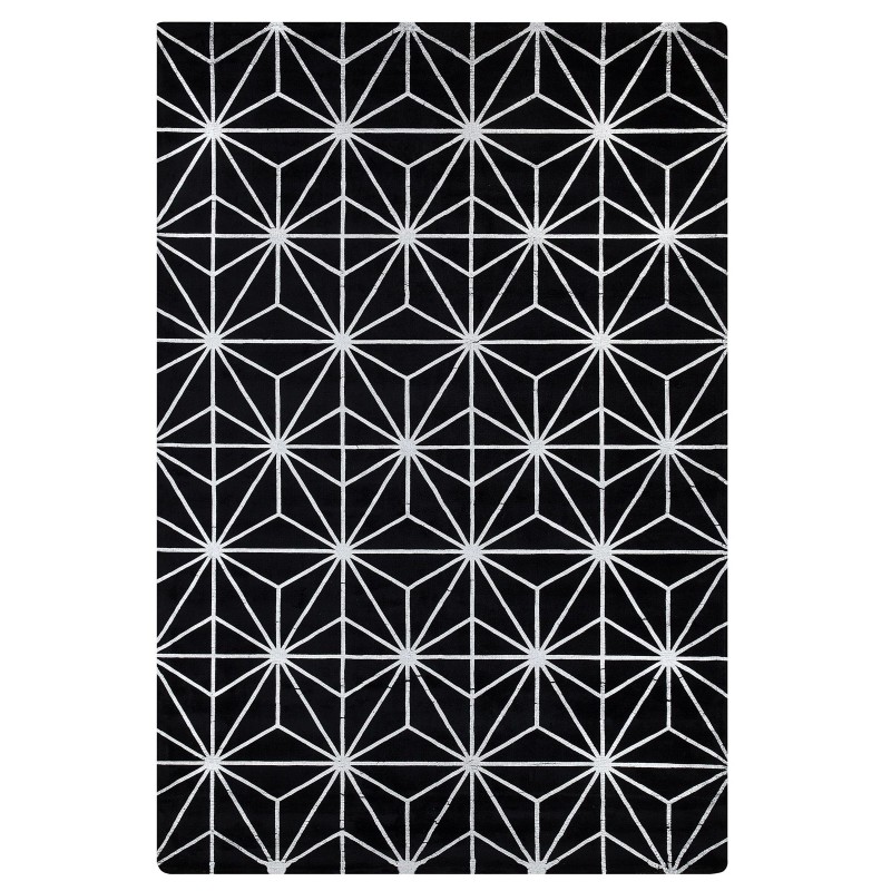 This rectangular, patterned rug is an excellent addition to any modern, traditional, and glam-inspired interior. Handwoven from viscose with a touch of cotton, it stands out for its high quality and precision craftsmanship. This material is also pleasant to the touch and features a velvety sheen. The rug is adorned with a silver geometric pattern, giving it an extraordinary charm.