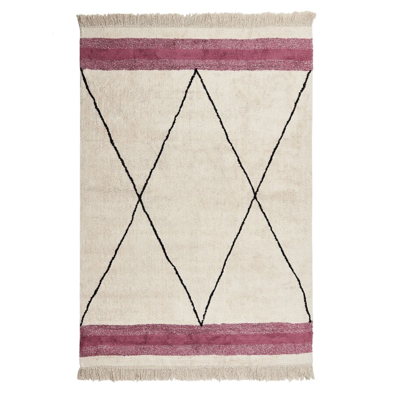 If you want your living room to be cozy and stylish, this rug will be an excellent choice. The geometric pattern in black on a beige background, fringes, and pink stripes will perfectly complement both traditional and modern interiors. The soft-to-touch cotton fabric ensures quality for years.