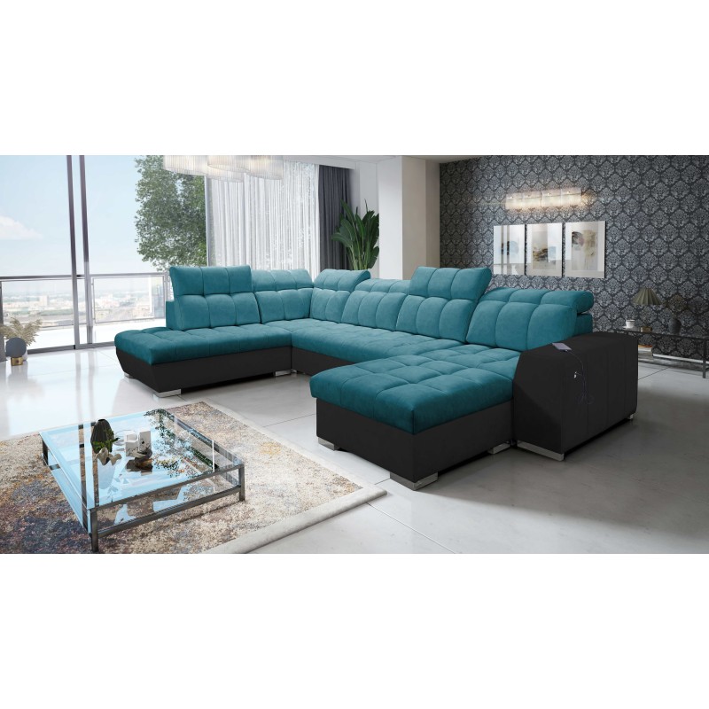 U-shaped corner sofa Prisma VI with a sleeping function, USB port, and storage for bedding in Terra 75 fabric + black Eco-leathe