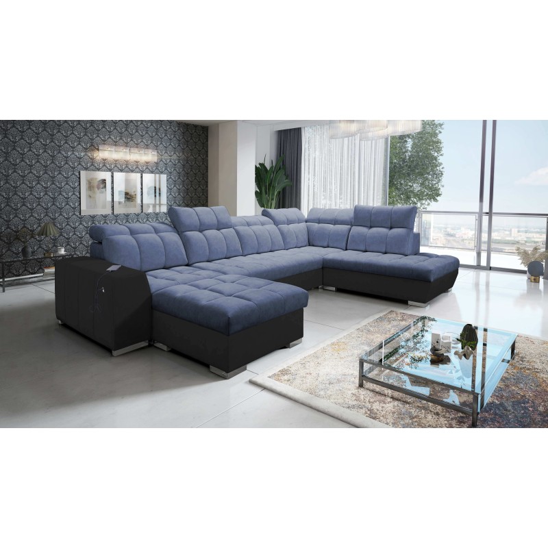 U-shaped corner sofa Prisma VI with a sleeping function, USB port, and bedding storage in Terra 76 fabric + black eco-leather
