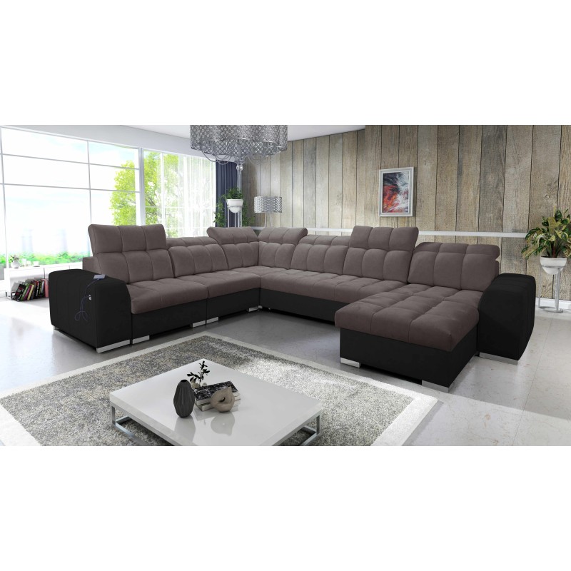 U-shaped corner sofa Prisma VIII with a sleeping function, USB port, and bedding storage, fabric Terra 26 + black eco-leather