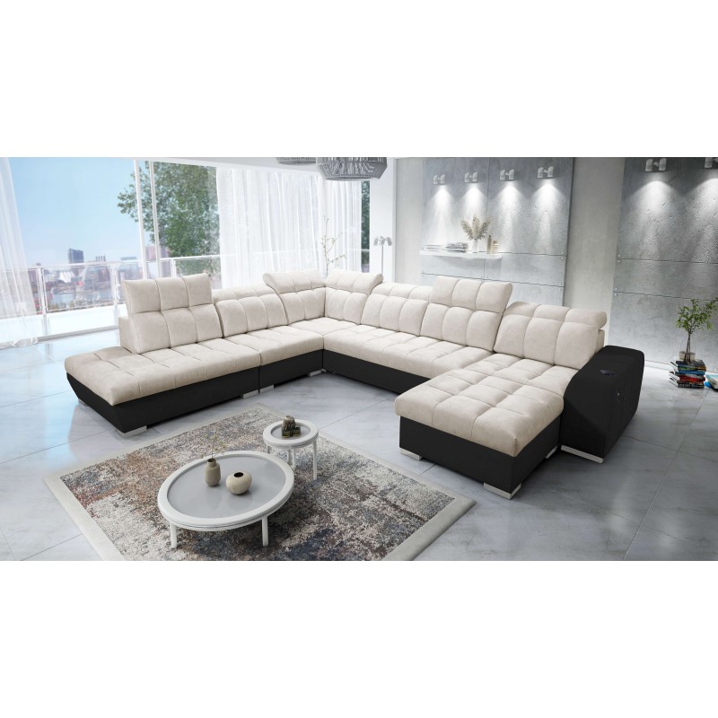 U-shaped Prisma X sectional sofa with a sleeping function, USB port, and bedding storage in Terra 13 fabric + black eco-leather