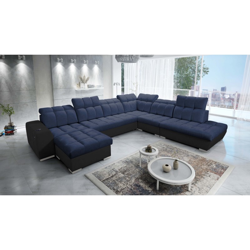 U-shaped corner sofa Prisma X with a sleeping function, USB port, and bedding storage, fabric Terra 79 + black eco-leather