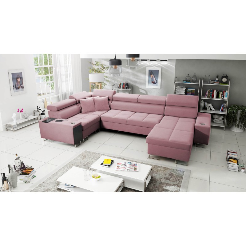 U-shaped corner sofa Orbix IV Mini with a sleeping function, adjustable headrests, USB port, and bedding storage in Ultario Vel