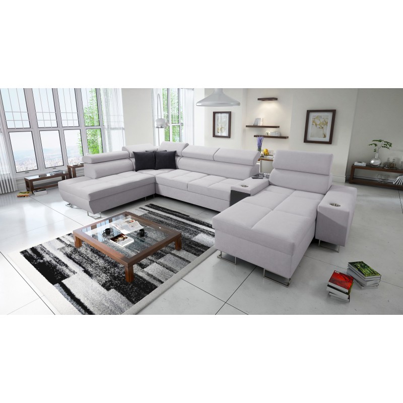 U-shaped corner sofa Orbix V with a sleeping function, adjustable headrests, USB port, and storage for bedding, fabric Sawana 84