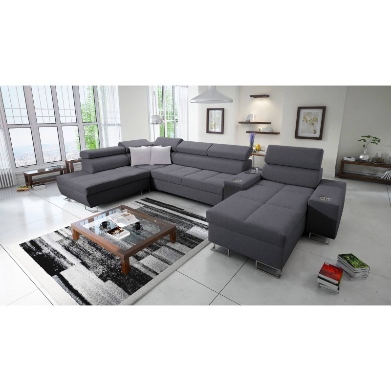 Orbix V U-shaped sectional sofa with a sleeping function, adjustable headrests, USB port, and storage for bedding, fabric Sawana