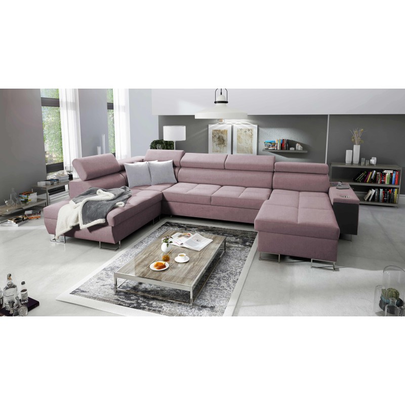 U-shaped Orbix VI sectional sofa with a sleeping function, adjustable headrests, USB port, and bedding storage, fabric Sawana 61