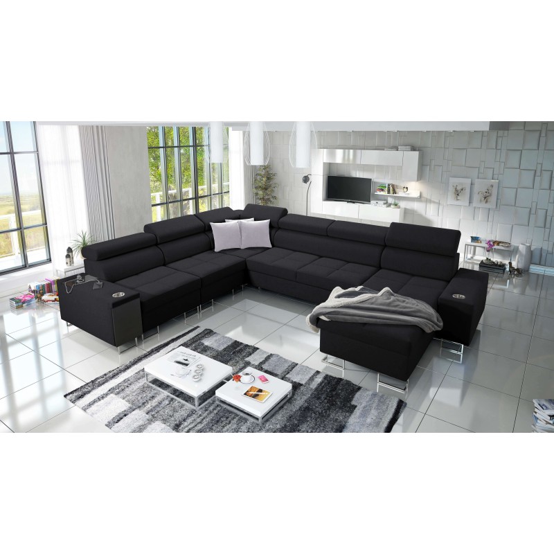 U-shaped corner sofa Orbix VIII with a sleeping function, adjustable headrests, USB port, and bedding storage in Sawana 14 fabri
