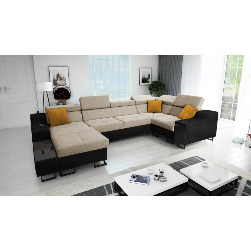 Avanti IV Mini U-shaped sectional sofa with a sleeping function and lamp with USB port, fabric Whisper 3 + black eco-leather