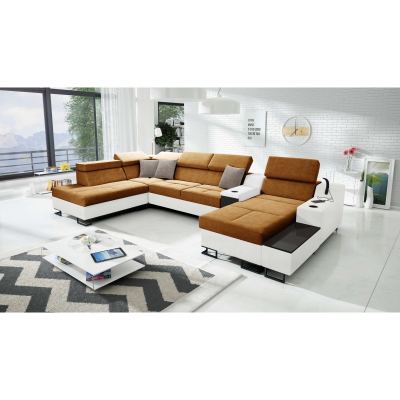 U-shaped Avanti V sectional sofa with a sleeping function and a lamp with a USB port, fabric Whisper 9 + Eco-leather