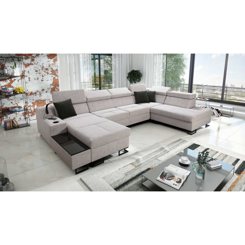 U-shaped Avanti VI sectional sofa with a sleeping function and a lamp with a USB port, fabric Whisper 16