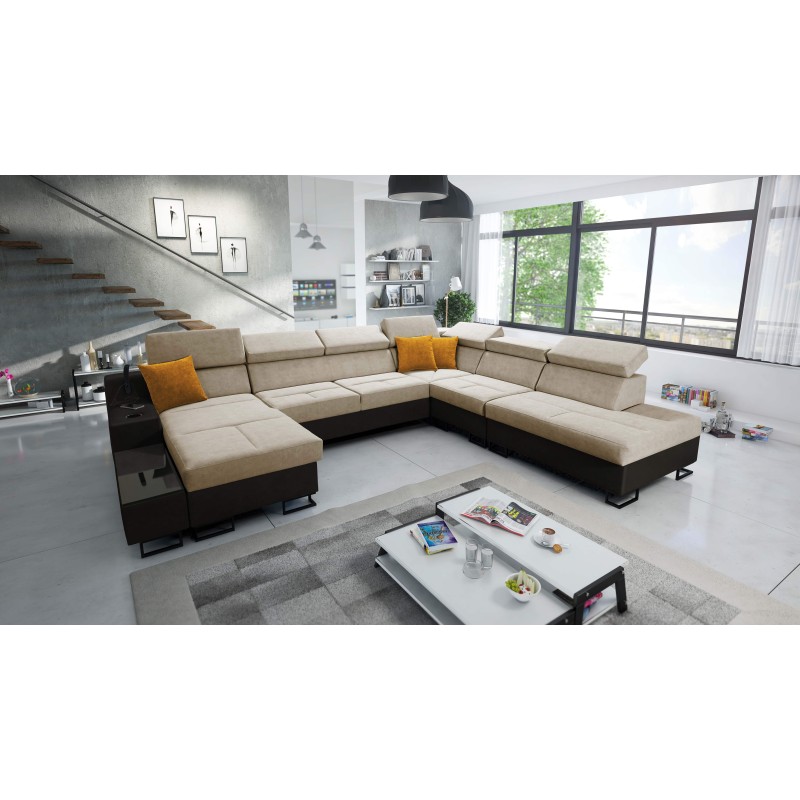 U-shaped Avanti X sectional sofa with a sleeping function and a lamp with a USB port, fabric Whisper 3 + black eco-leather