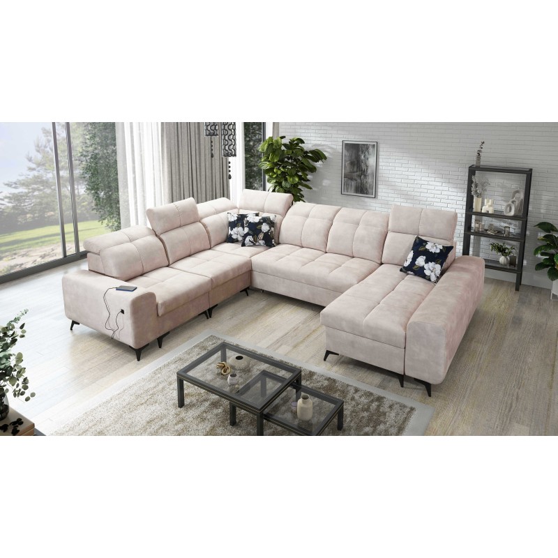Narożnik w kształcie U Ascot VIII z funkcją spania, portem usb i regulowane zagłówki tkanina Wave 2