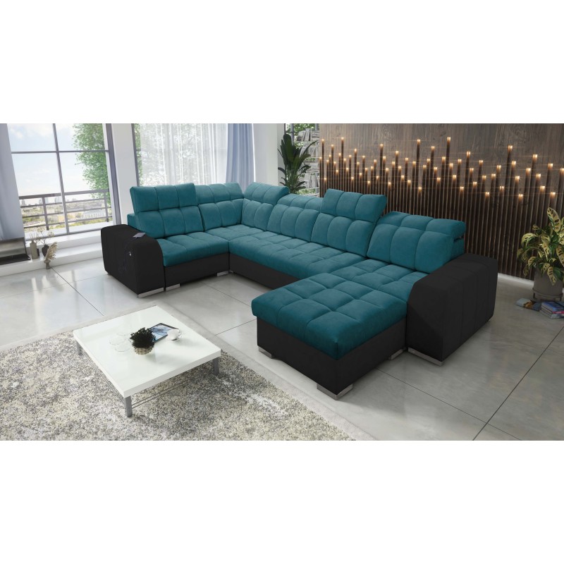 Narożnik w kształcie U Prisma IV z funkcją spania, portem usb oraz pojemnikiem na pościel tkanina Terra 75 + Ecoskóra czarna