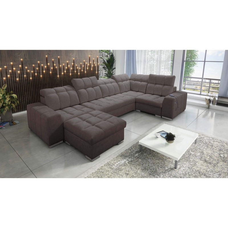 Narożnik w kształcie U Prisma IV z funkcją spania, portem usb oraz pojemnikiem na pościel tkanina Terra 26