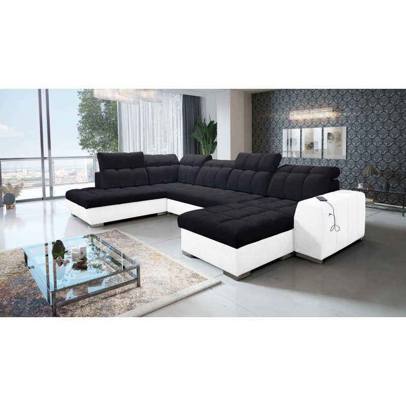 Narożnik w kształcie U Prisma VI z funkcją spania, portem usb oraz pojemnikiem na pościel tkanina Terra 99 + Ecoskóra