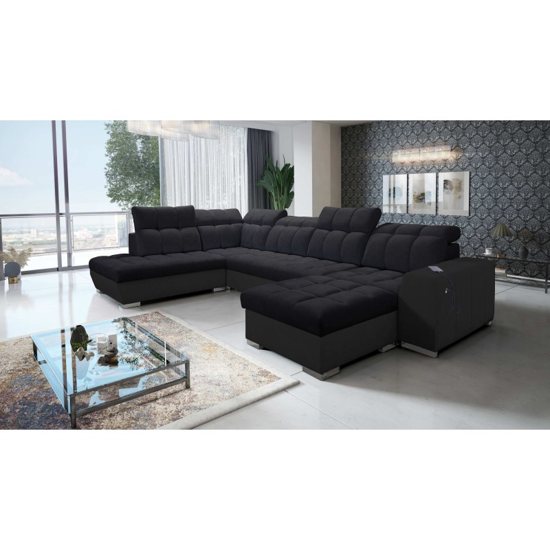 Narożnik w kształcie U Prisma VI z funkcją spania, portem usb oraz pojemnikiem na pościel tkanina Terra 99 + Ecoskóra czarna