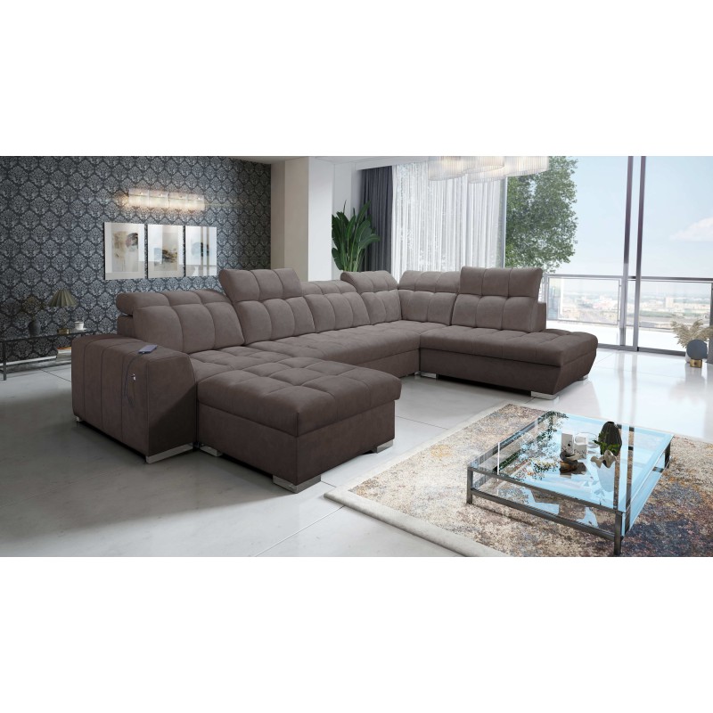 Narożnik w kształcie U Prisma VI z funkcją spania, portem usb oraz pojemnikiem na pościel tkanina Terra 26