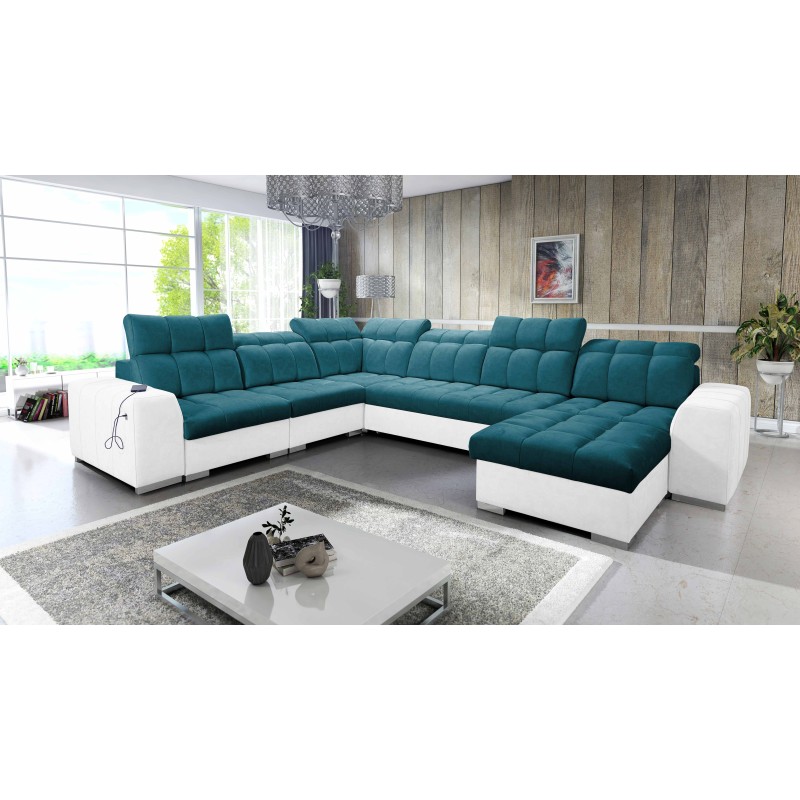 Narożnik w kształcie U Prisma VIII z funkcją spania, portem usb oraz pojemnikiem na pościel tkanina Terra 75 + Ecoskóra