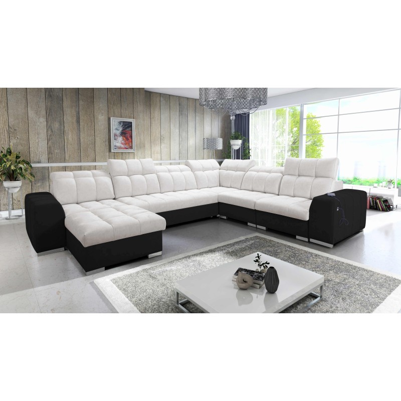 Narożnik w kształcie U Prisma VIII z funkcją spania, portem usb oraz pojemnikiem na pościel tkanina Terra 06 + Ecoskóra czarna
