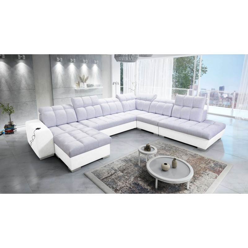 Narożnik w kształcie U Prisma X z funkcją spania, portem usb oraz pojemnikiem na pościel tkanina Terra 80 + Ecoskóra