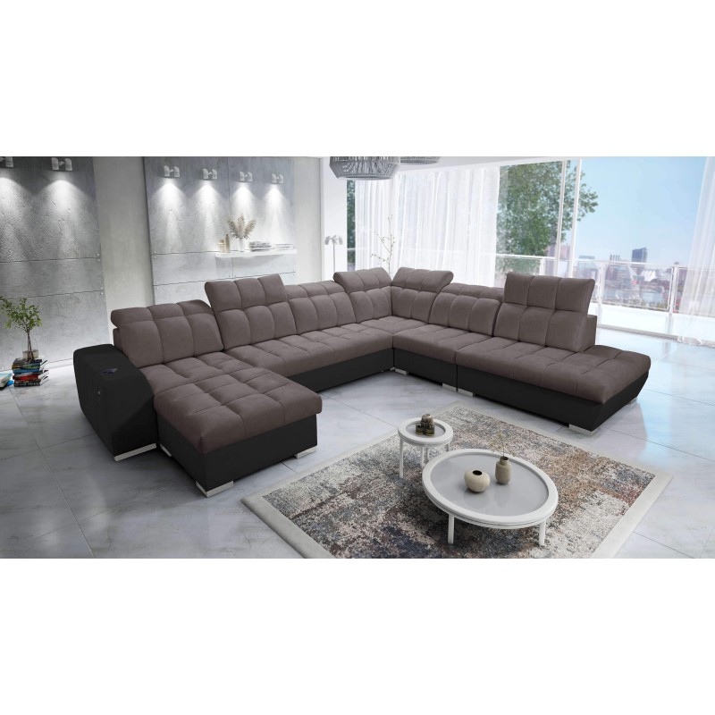 Narożnik w kształcie U Prisma X z funkcją spania, portem usb oraz pojemnikiem na pościel tkanina Terra 26 + Ecoskóra czarna