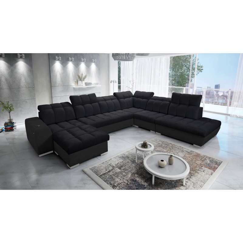 Narożnik w kształcie U Prisma X z funkcją spania, portem usb oraz pojemnikiem na pościel tkanina Terra 99 + Ecoskóra czarna