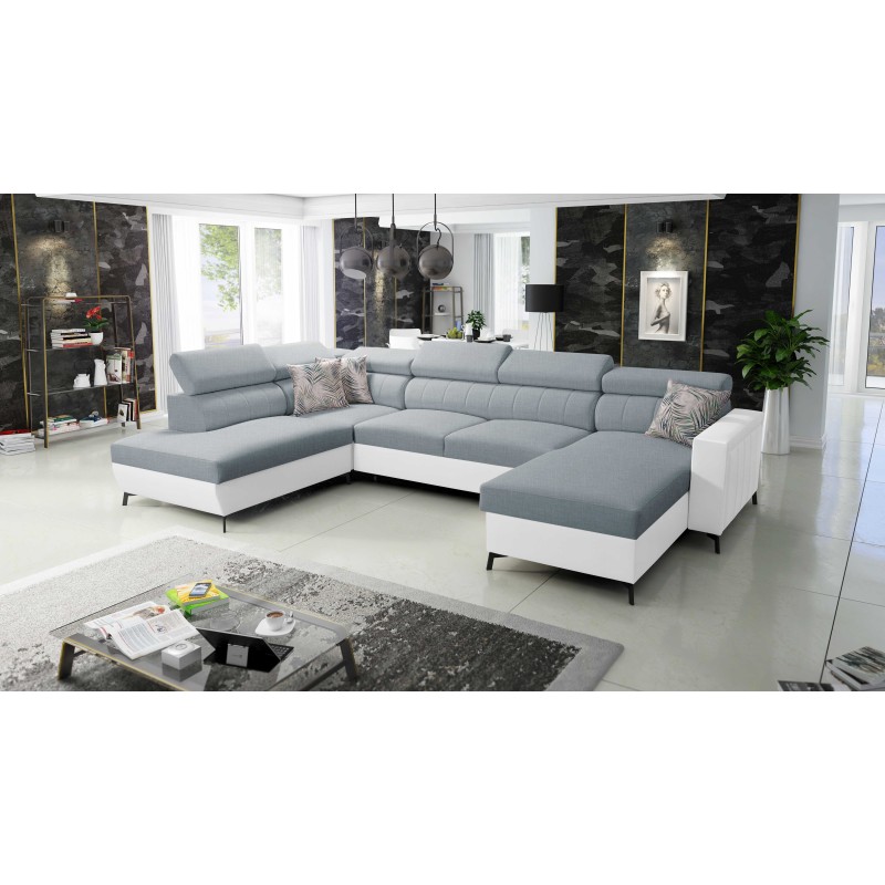 Narożnik w kształcie U Arco VI z funkcją spania, regulowane zagłówki tkanina Sawana 72 + Ecoskóra