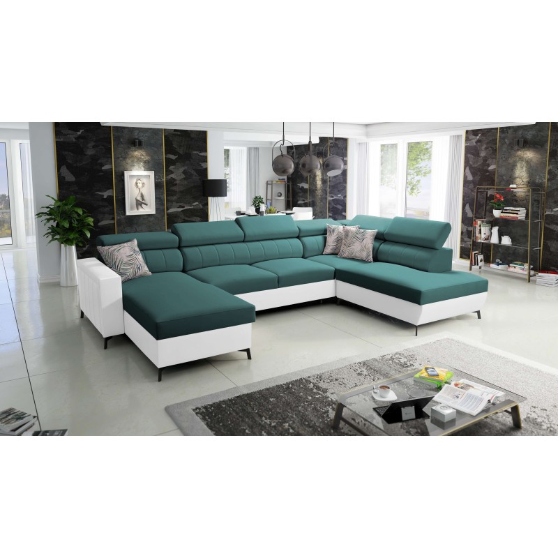 Narożnik w kształcie U Arco VI z funkcją spania, regulowane zagłówki tkanina Mono 238 + Ecoskóra