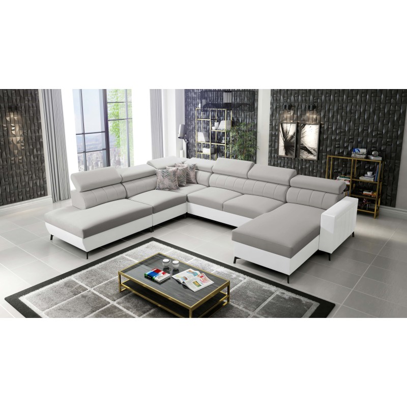 Narożnik w kształcie U Arco IX z funkcją spania, regulowane zagłówki tkanina Mono 244 + Ecoskóra