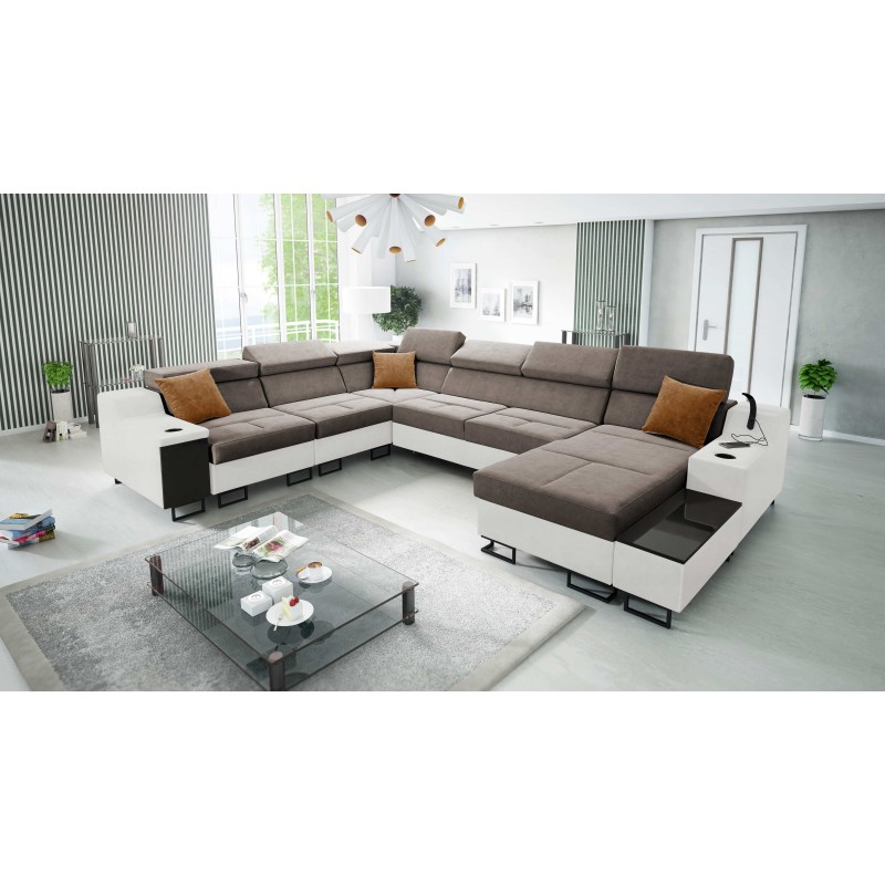 Narożnik w kształcie U Avanti VIII z funkcją spania oraz lampką z portem usb tkanina Whisper 5 + Ecoskóra