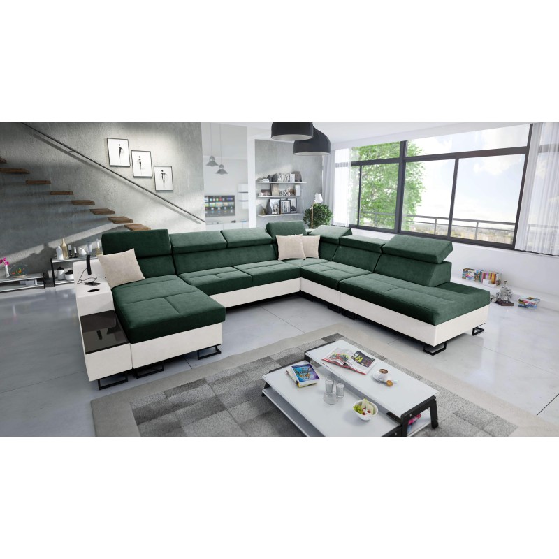 Narożnik w kształcie U Avanti X z funkcją spania i lampką USB | Welur, Whisper 11 + Ecoskóra