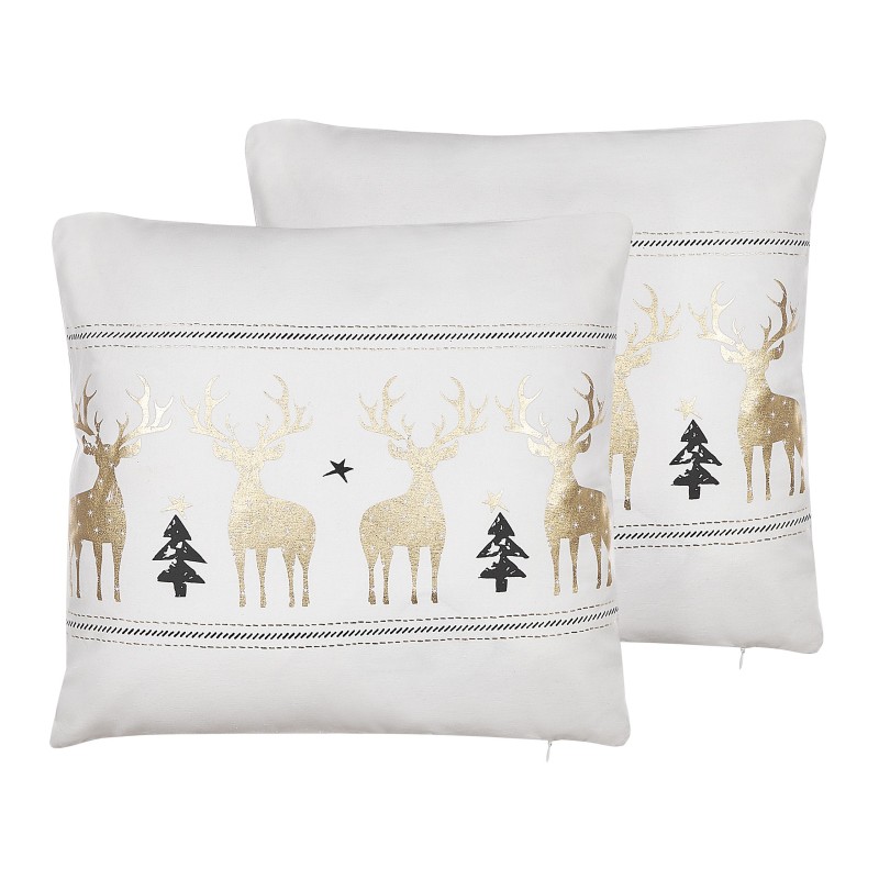 Підкресліть святкове оформлення свого дому за допомогою цього комплекту з двох декоративних подушок. Їхні наволочки виготовлені з високоякісної бавовни нейтрального кольору, завдяки чому вони підійдуть до будь-якої кімнати. Прикрашені візерунком з ялинками та золотими оленями, вони є чудовою прикрасою для будь-якого дивана, ліжка чи крісла. Подушки мають наповнювач з поліестеру та застібку-блискавку для легкого чищення.