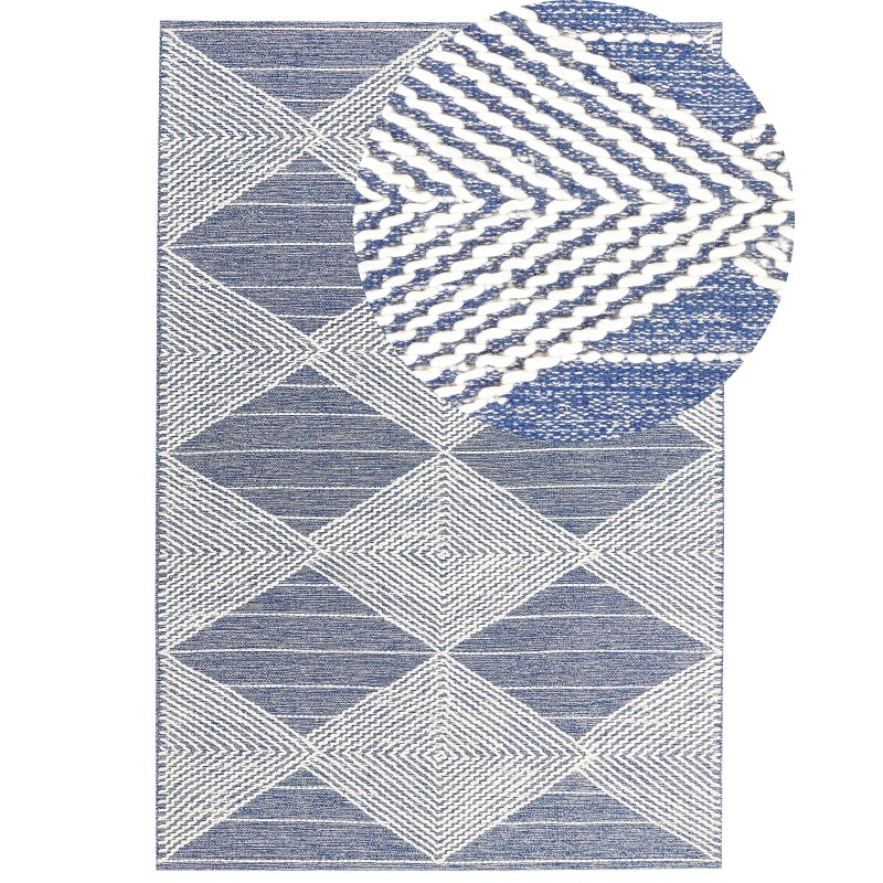 Цей килим з петльовим ворсом поєднує в собі високоякісні матеріали та стиль бохо. Він виготовлений з вовни та поліестеру, які відрізняються міцністю та м'якою структурою. Ручне ткацтво з геометричним узором представляє ромби в ніжних відтінках синього та світлого бежевого кольорів, завдяки чому килим впишеться як у сучасні, так і в традиційні інтер'єри.