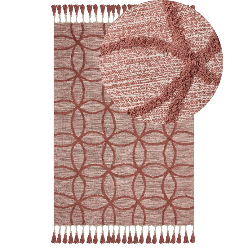 Приверніть увагу до своєї вітальні чи спальні за допомогою цього прямокутного, унікального килима. Цей виріб виготовлений вручну, завдяки чому кожна модель з цієї колекції буде неповторною. Усе це без проблем приверне увагу завдяки візерунку на своїй поверхні, а також китицям у відповідному червоному кольорі. Цей аксесуар стане ідеальним доповненням до повсякденного простору, оскільки виготовлений з бавовни, що робить його міцним і приємним на дотик.
