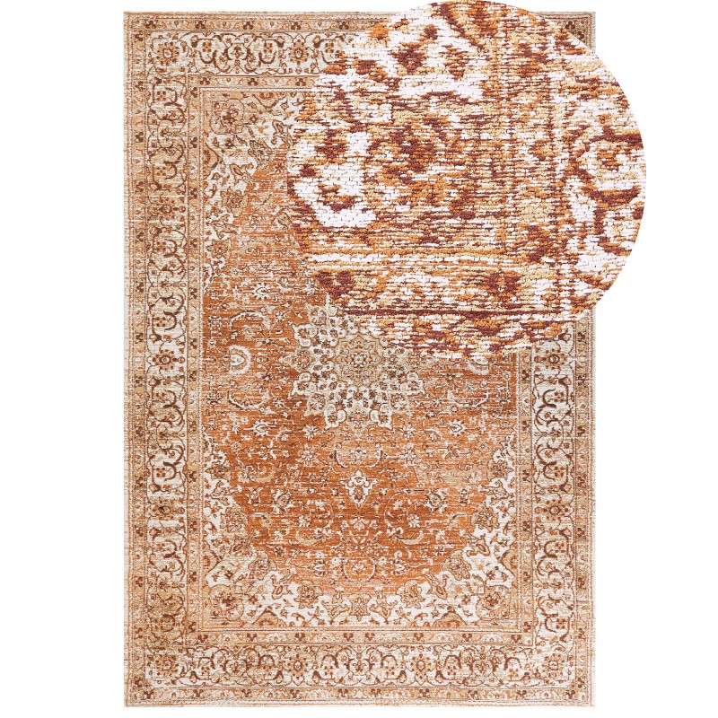 Цей килим безумовно приверне увагу домочадців і зробить інтер'єр вашої квартири незабутнім. Його найбільша перевага - зістарений візерунок, натхненний орієнтальними мотивами, в помаранчевому кольорі. Завдяки цьому аксесуар підійде для багатьох різних приміщень, оформлених у стилях вінтаж і ретро. Весь виріб виготовлено з високоякісної бавовни та поліестеру, що робить килим міцним і дуже приємним на дотик.