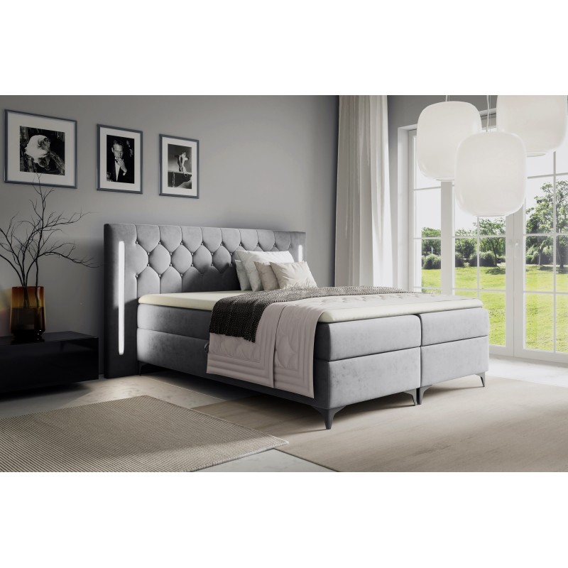 Для виробництва матраца ми використовували пружини типу бонель, які гарантують оптимальну підтримку для хребта і комфортний сон. Додатковий поверхневий матрац (TOPPER) виготовлений з піни T-25 висотою 4 см забезпечить додатковий комфорт і зручність під час сну. Ліжко також має два контейнери для постільної білизни, які допоможуть підтримувати порядок у спальні. Завдяки механізму на пружинах відкривання контейнера - це справжнє задоволення. Ніжки з металу чорного кольору додають ліжку стабільності та елегантності.